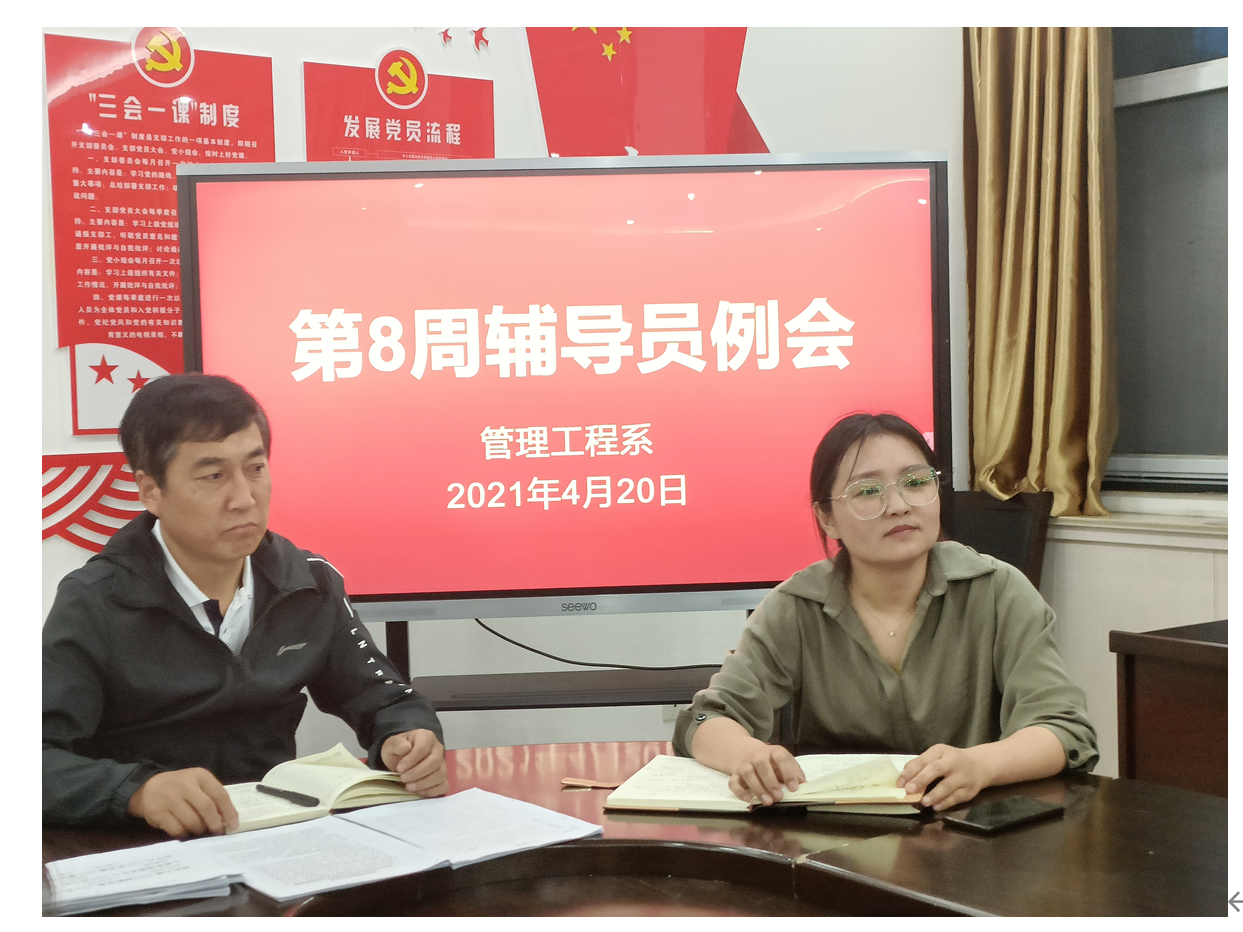 4月20日晚,在2号教辅楼管理工程系党员活动室召开第8周辅导员例会,副主任刘树平、副主任刘小毛以及我系所有辅导员参加会议。