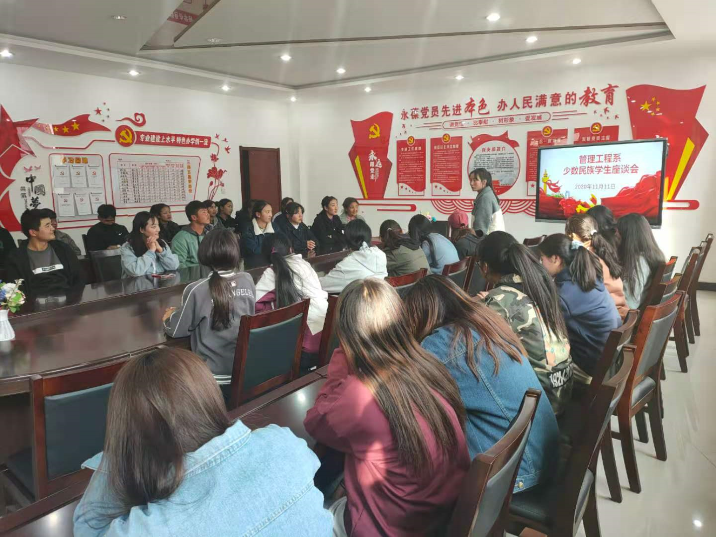 2020年11月11日下午14:30,在2号行政楼管理党支部党员活动室组织召开了少数民族学生座谈会,参加本次会议的有:管理工程系主任周恩善教授、副主任刘树平、学工办负责人刘小鹏、辅导员李焱斌和关琦老师,以及来自藏族、回族的37名少数民族学生。本次座谈会旨在关爱少数民族同学,全面了能并解决他们在学习与生活中存在的困惑和问题,听取意见或建议,让少数民族同学更快更好地融入到365上市公司官网这个大家庭。会议由刘小鹏同志主持。