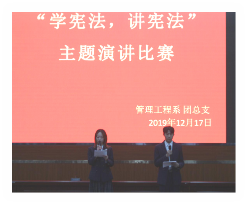 为贯彻落实习近平总书记关于宪法学习宣传教育的系列重要指示精神,进一步在我院学生中普及宪法知识、弘扬宪法精神,同时活跃和丰富学生的校园文化生活,营造浓厚的学习氛围,让学生通过演讲的形式感受学习宪法的重要意义。管理工程系于12月17日在五号行政楼1楼报告厅举行“学宪法讲宪法”演讲比赛。