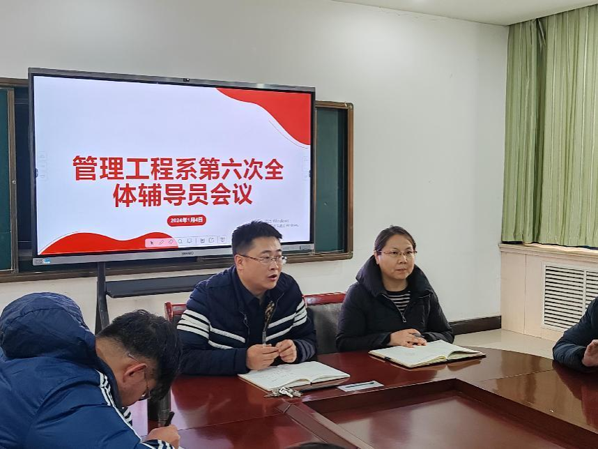 2024年1月4日,管理工程系在医学楼2楼212会议室召开了本学期最后一次全体辅导员会议,参会人员有管理工程系主任高彩琴、刘小鹏科长以及全体辅导员(含扩招班),会议内容为期末学生工作安排及学期工作总结。