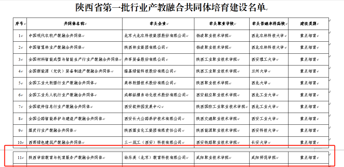 “陕西学前教育与托育服务产教融合共同体”的成立落实了陕西省教育厅办公室《关于加快推进落实现代职业教育体系建设改革重点任务的通知》(陕教职办〔2023〕33号)精神,推动学前教育与托育服务行业创新发展。共同体于2024年2月获批陕西省第一批行业产教融合共同体重点培育项目,由幼乐美(北京)教育科技有限公司、咸阳师范学院和咸阳职业技术学院联合行业企业、高等院校、科研机构、行业协会和上下游企业等共同发起成立。旨在促进产业与教育的深度融合,推动行业的技术创新和人才培养,打造具有行业示范性的高质量产教融合样板。