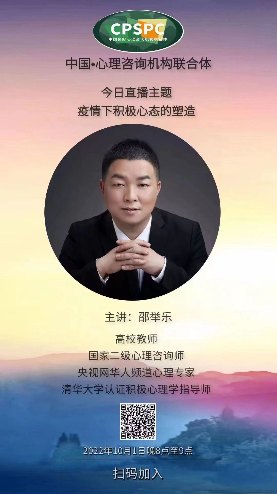 为了在疫情防控静态管理周引导学生合理自我调节情绪并进行积极的心理建设,学生工作处于2022年10月1日晚20:00-21:00组织全体学生线上观看以“疫情下积极心态的塑造”为主题的心理讲座。本次讲座的主讲老师为国家二级心理咨询师邵举乐。