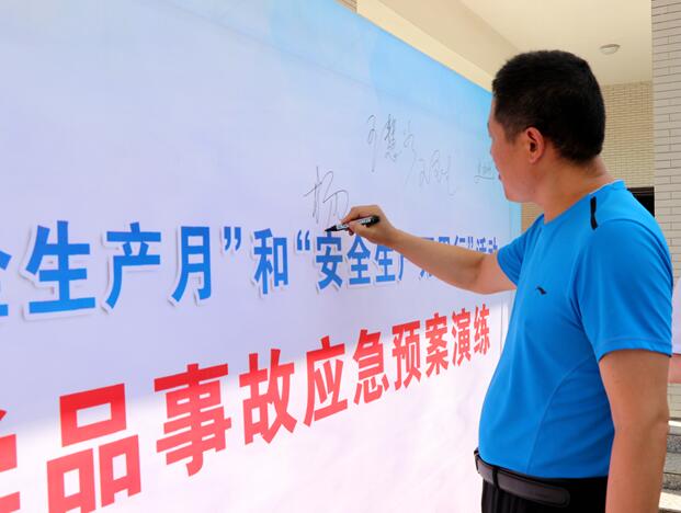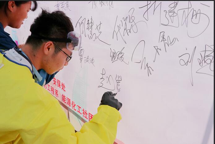 化工-电力工程系副主任白韡担任演练活动总指挥。首先进行的是安全签字仪式,所有出席的领导、嘉宾和师生都在安全宣传展板上签上了自己的名字。签字仪式结束之后各演练小组迅速就位,准备本次应急演练。本次应急演练包括两个事故,分别是浓硫酸泄漏事故和乙醇燃烧火灾事故。