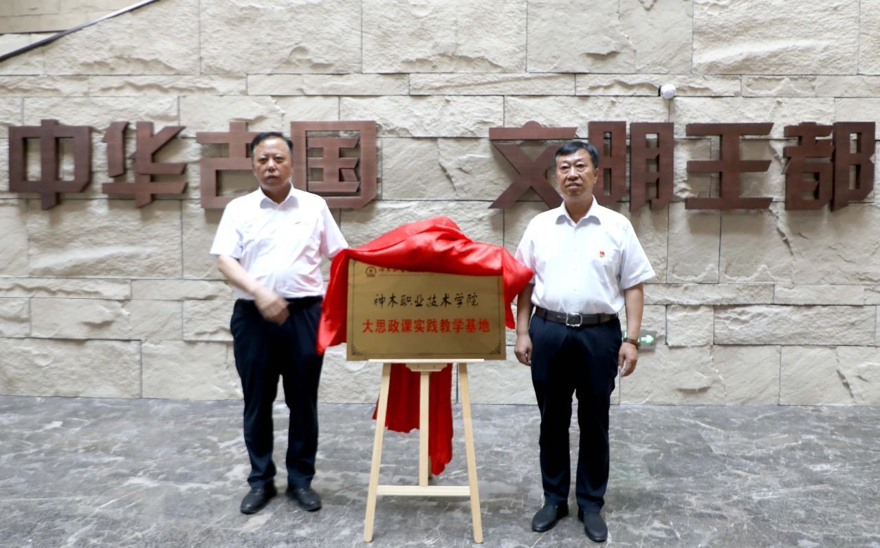 为深入学习贯彻习近平新时代中国特色社会主义思想,引导和帮助广大青年学生上好与现实相结合的“大思政课”,5月22日,神木职院“大思政课”石峁博物馆实践教学基地揭牌,神木职院党委书记艾国和石峁遗址管理处处长刘亚功共同为“大思政课”实践教学基地揭牌。