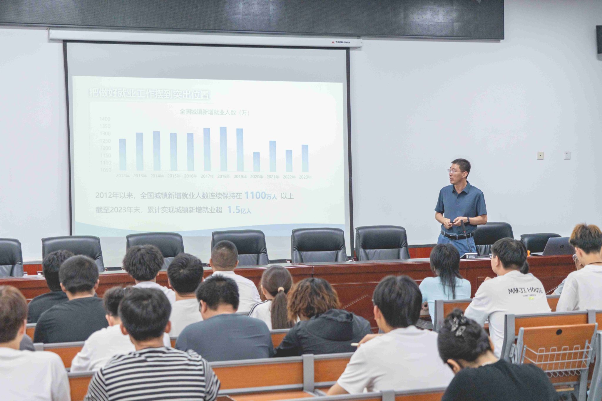 李建法以“就业就是最大的民生”为切入点,围绕“就业形势总体稳定、就业压力仍存、确保就业优先、着力拓宽就业渠道”,结合当前国家就业形势,引导学生正确认识当前就业形势。他还介绍了学校近年来在就业工作中的一系列成绩和推进高质量就业的措施,借此勉励同学们增强信心,积极参与到就业准备工作中,做更好的自己。他指出,当前我国稳就业政策持续显效,就业形势逐步改善,但就业短期风险和长期挑战交织,稳就业任务仍然繁重。因此,大家要科学理性地看待就业面临的问题和挑战,树立正确的择业观和就业观,克服“慢就业”“缓就业”“暂不就业”的心理,做好自身职业规划和职业选择。