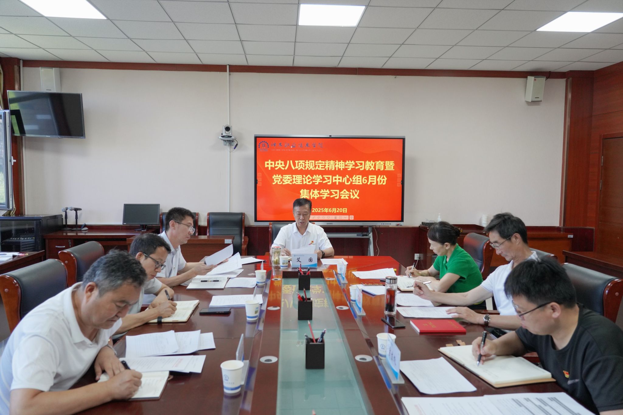 6月20日,神木职院召开深入贯彻中央八项规定精神学习教育暨党委理论学习中心组6月份集体学习会议,会议由党委书记艾国主持,在家党委班子成员,组宣部、党政办、纪检监察室、学生处相关部门负责人参加会议。