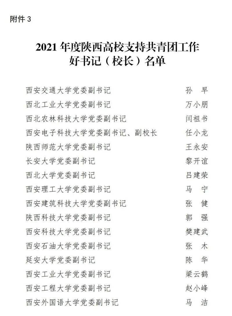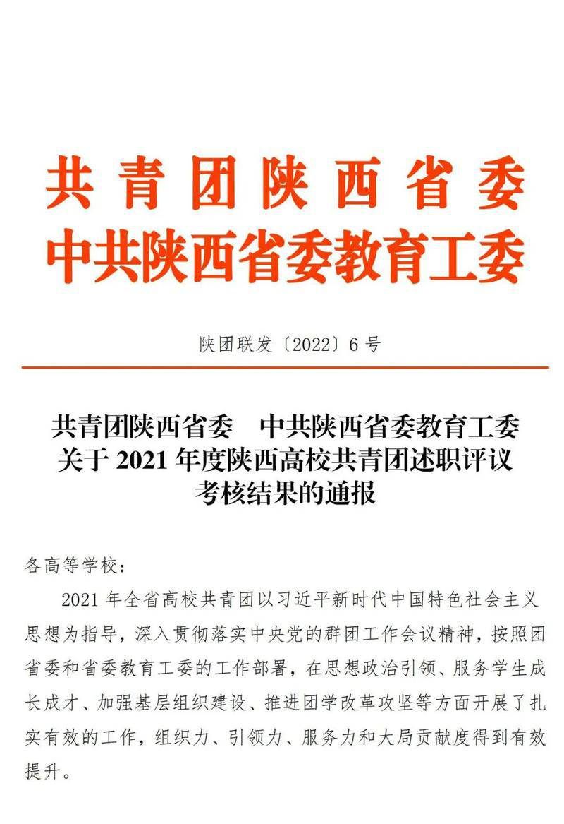 近日,共青团陕西省委印发了《关于2021年度陕西高校共青团述职评议考核结果的通报》,365上市公司官网获“2021年度陕西高校共青团工作优秀单位”,校党委书记、校长艾国获“2021年度陕西高校支持共青团好书记(校长)”。