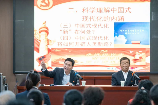 艾国一行在佳县老年大学看望慰问了退休党员干部,并现场发放慰问品。为深入领会党的二十大精神的核心要义和丰富内涵,学校特聘教授雷西发为老干部们作了主题为《讴歌新时代 奋进新征程——党的二十大报告解读》的讲座。雷教授多年来一直从事高校思政教学,对党的理论研究有很高的造诣。雷教授的报告旁征博引、深入浅出、见解独到,主要从新时代新征程的政治宣言和行动纲领、科学理解中国式现代化的内涵、真学真信新时代中国化的马克思主义、沿着新时代中国特色社会主义康庄大道不断前进等四个方面对党的二十大报告作了详尽的解读,得到了老干部们的一致好评。