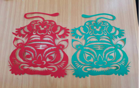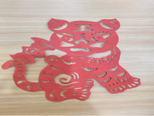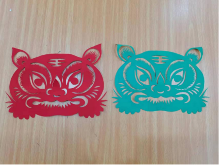 卢先老师介绍到:剪纸非常适合我们现在的学生,这门艺术上手快,获得感强,容易调动人们的积极性和成就感。只见同学们人手几张红纸、一把剪刀,如同被附上了魔法一般 ,片刻之后,一只只栩栩如生的胖头虎圆润可爱,额头上的“王”字独显出它的霸气,多种姿态的老虎呈现出来。