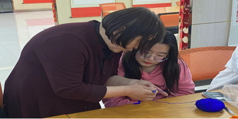 老师给学生们示范了如何拿钩针、起针,耐心讲解钩织的方法、并从起针方法和钩织的基本针法入手,教学生们在编织时相互换用,为同学们答疑解惑。