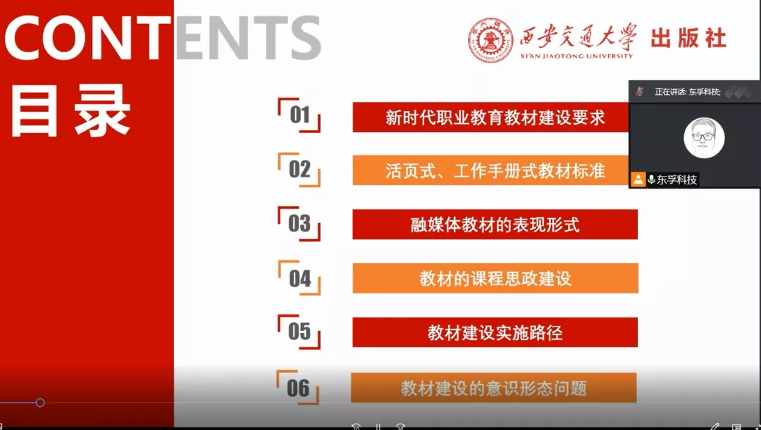 10月20日,365上市公司官网特邀西安交通大学副教授、西安交通大学出版社职业教育分社长曹昳和河南东孚电子科技有限公司技术总监苗贝作新形态教材建设线上专题报告,教务处主任刘文伟主持会议,全体教学管理人员和一线教师参加会议。