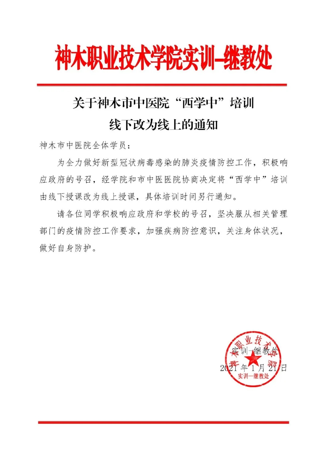 关于神木市中医院“西学中”培训 线下改为线上的通知