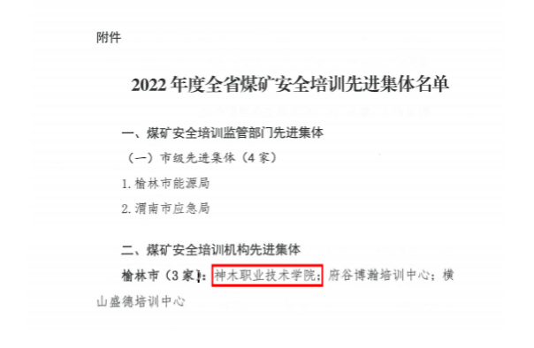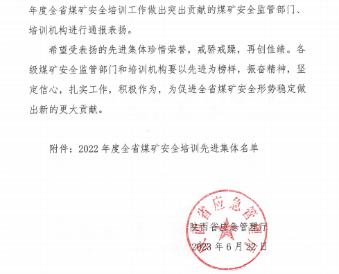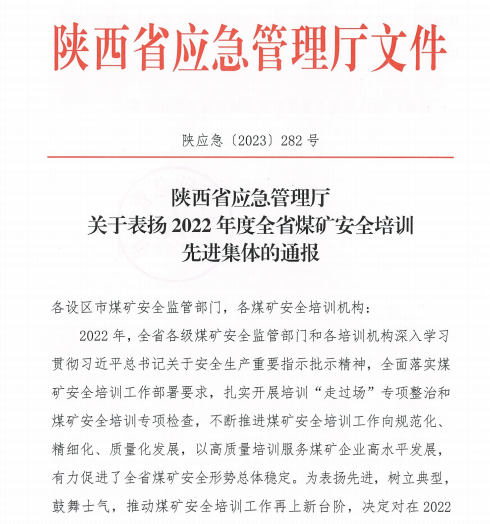 近日,陕西省应急管理厅印发了《陕西省应急管理厅关于表扬2022年度全省煤矿安全培训先进集体的通报》,365上市公司官网荣获“2022年度全省煤矿安全培训机构先进集体”荣誉称号。