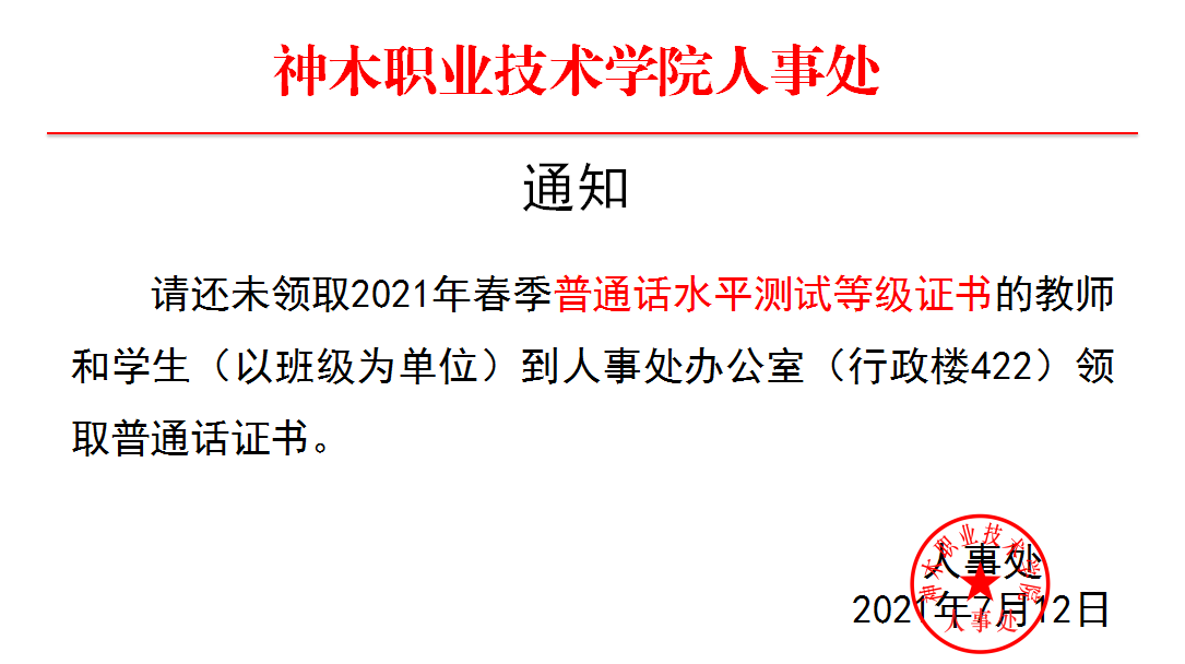 关于领取2021年春季普通话水平测试等级证书的通知