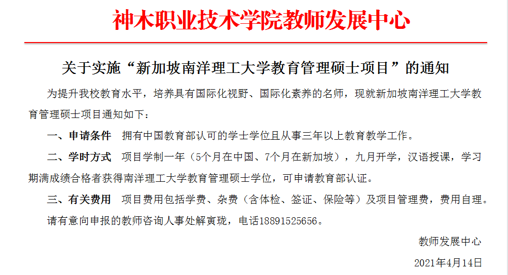关于实施“新加坡南洋理工大学教育管理硕士项目”的通知