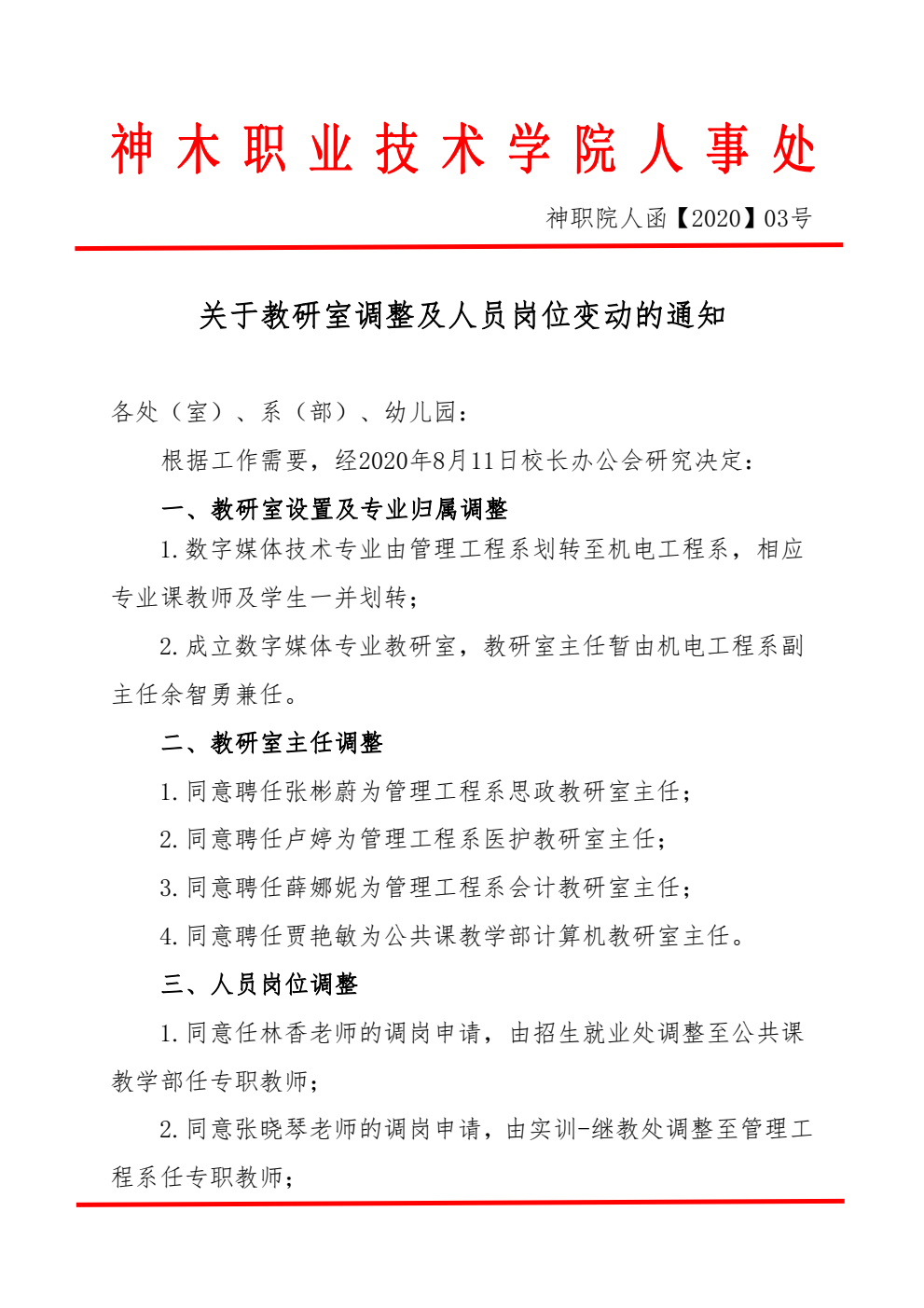 关于教研室调整及人员岗位变动的通知