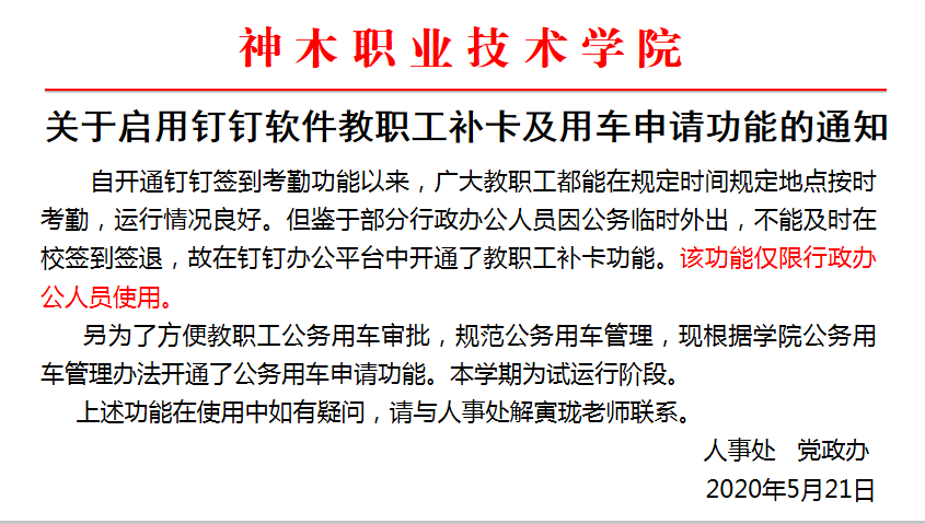 关于启用钉钉软件教职工补卡及用车申请功能的通知