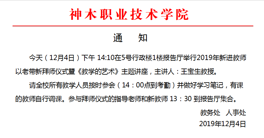 关于2019年新进教师拜师仪式暨《教学的艺术》主题讲座的通知