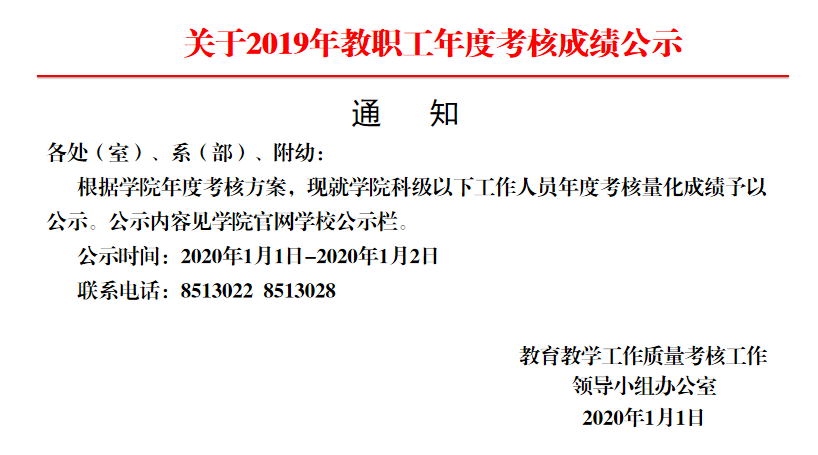 关于2019年教师教育教学工作质量考核成绩公示通知