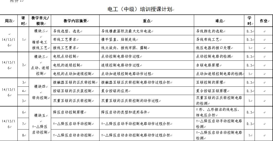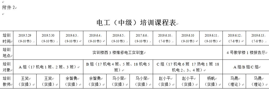 根据技能鉴定的需求,对我校报考国家职业技能资格考试《电工(中级)》的116名同学进行培训,培训起止日期为:2019年5月29日至2019年6月13日,共计22课时。参加培训的学生分为A、B、C三组,实操培训时,A、B、C三组分开进行:分组培训的名单见附件3,理论培训时,A、B、C三组统一进行培训,由马晟老师负责指导。鉴于热电专业学生没有系统学习《电机与电气控制技术》等关键课程的情况,允许报考电工(中级)的热电专业学生结合自身的时间安排(5月29日至6月13日)全程参与培训。