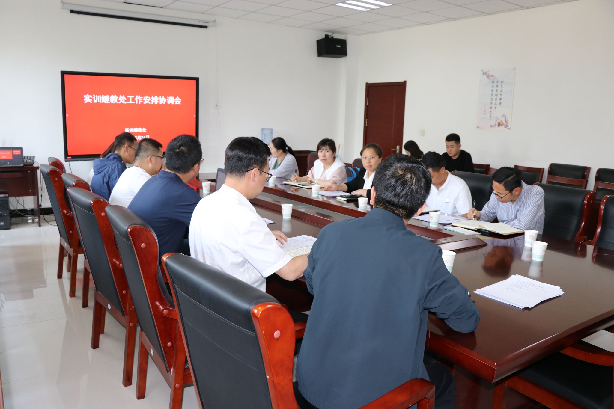 5月24日下午,实训继教处在1号教辅楼211会议室召开了工作协调会。学院副校长李建法及各系部负责人、教学科科长参加了本次会议。会议由实训继教处处长王笑主持。