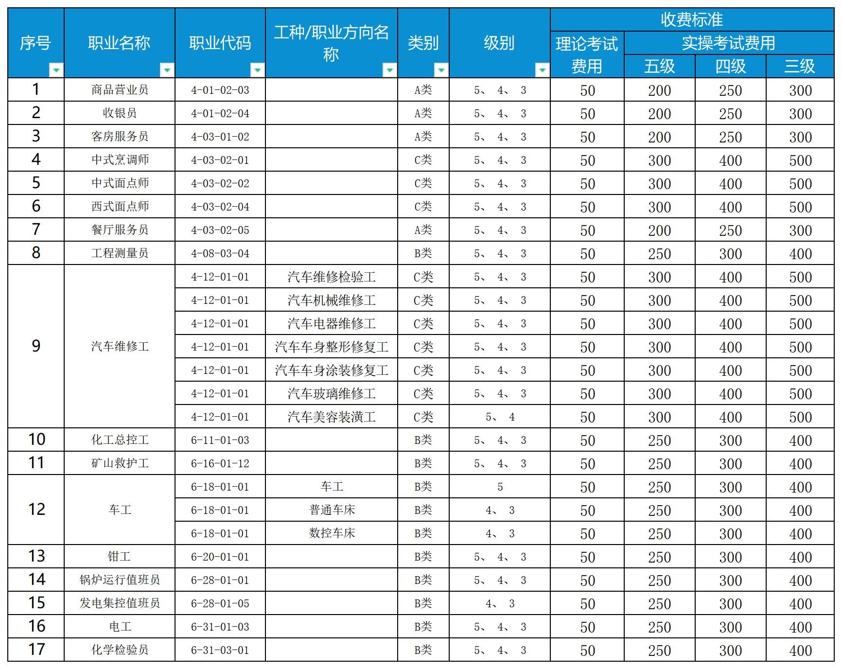 按照省人社厅《陕西省人力资源和社会保障厅关于规范全省职业技能鉴定标准的通知》(陕人社函〔2019〕555号)文件要求,我评价中心技能等级认定收费标准如下: