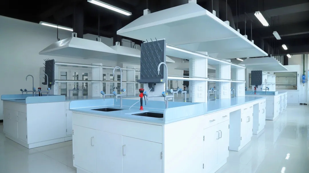 新建基础类化工实验室水电到位,设有通风橱换气设备,独立天平室,布局合理,采光良好,保持自然通风。仪器设备种类配套、台套数量齐全。实验台采用防酸碱阻燃面板,实验台旁设有水槽并配置洗眼器。楼道设置应急喷淋,安全设施齐全。