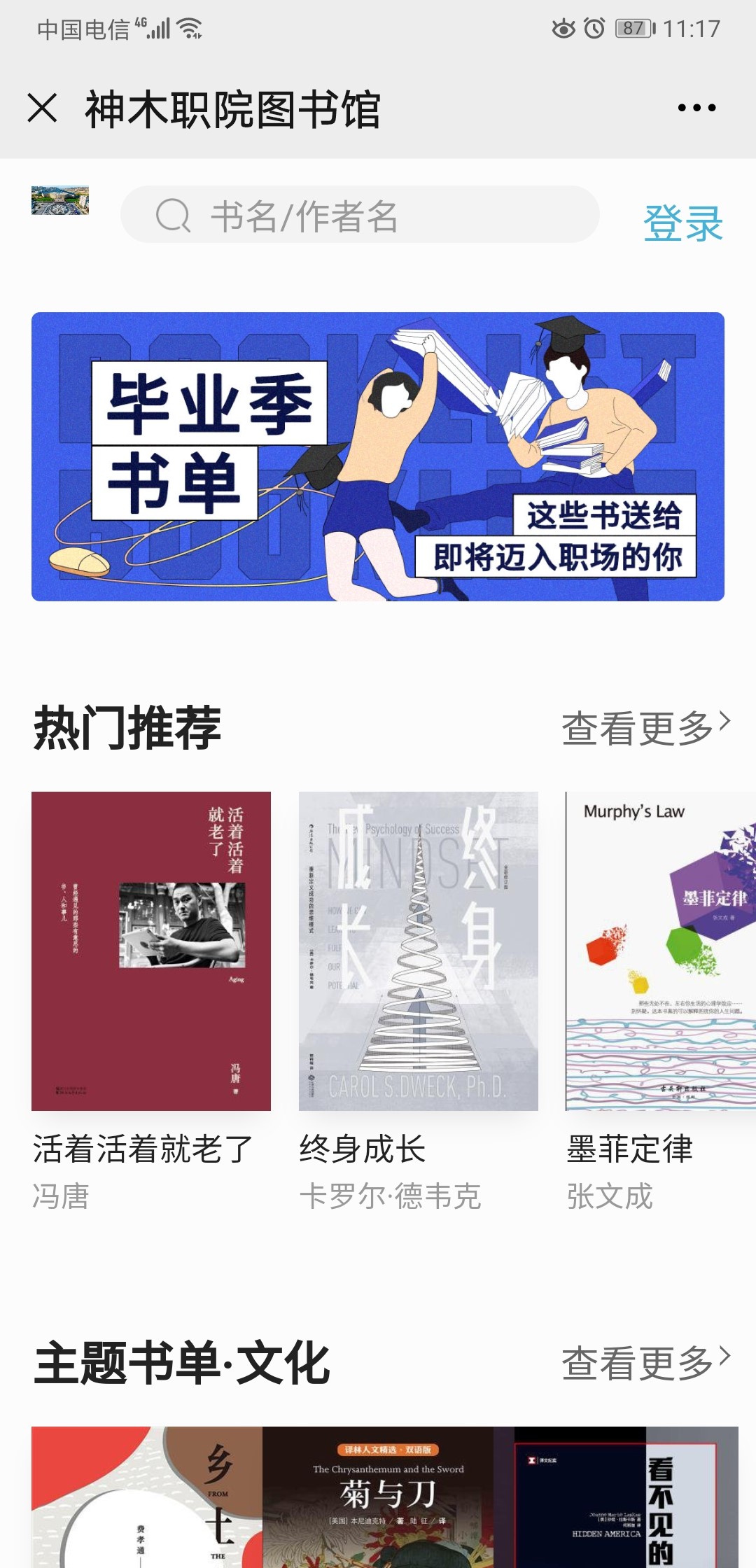 院专属定制推出的“基于互联网数字图书馆”服务数字阅读平台,专用机构名称为“神木职院图书馆”,该平台资源精选出版图书资源50000册,内容包括畅销书籍、教育读物、经典名著等,并涵盖多个国内外奖项,大奖包括茅盾文学奖、诺贝尔文学奖、鲁迅文学奖、雨果奖、星云奖、文津图书奖、中国好书等。畅销书与新书占比高,其中当当新书热卖榜覆盖80%,亚马逊销售排行榜覆盖100%,近3年上市新书占比50%以上。欢迎广大师生读者下载访问阅读