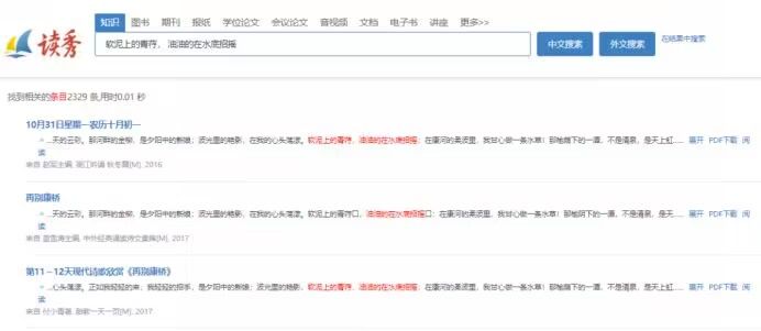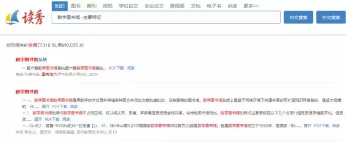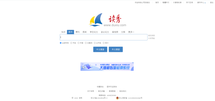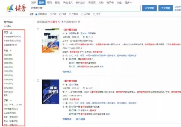 读秀是由海量全文数据及资料基本信息组成的超大型数据库,能为您提供660万种图书题录信息,17.6亿页全文资料,涵盖338万种中文图书全文,1.2亿篇期刊资料,以及报纸、论文、词条、人物,和外文资料等一系列学术资源。并且以每年十万种左右的速度递增。为用户提供深入到图书章节和内容的全文检索,部分文献的原文试读,以及高效查找、获取各种类型学术文献资料的一站式检索,周到的参考咨询服务,是一个真正意义上的学术搜索引擎及文献资料服务平台。