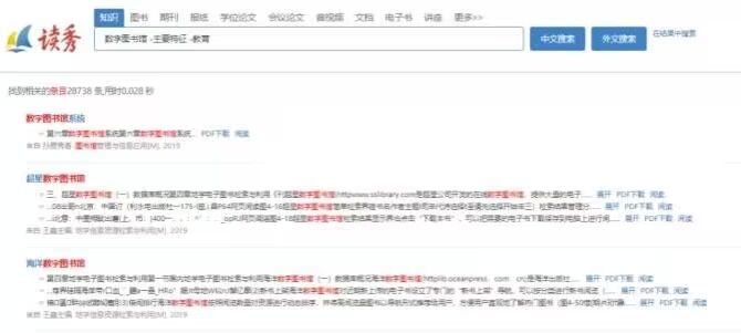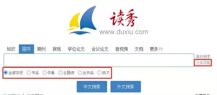 读秀包括知识、图书、期刊、学位论文、会议论文、音视频、文档、考试辅导、课程、词典、标准、专利、百科、讲座、电子书、政府信息等数字资源检索类型,并且可以选择中文或外文搜索方式。