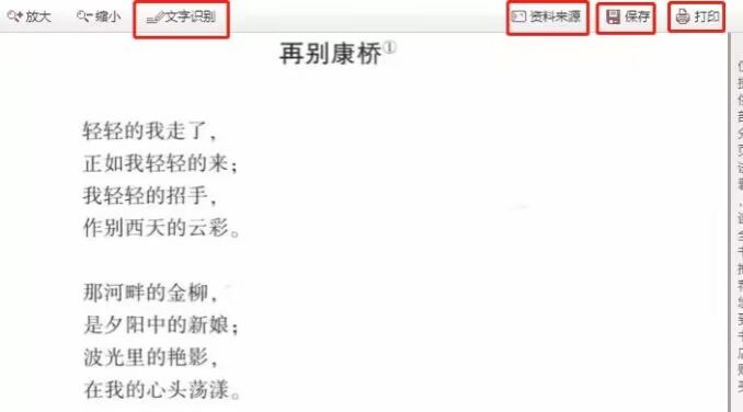 3. 进入阅读界面后,可以进行文字摘录及提取,并可查看资料来源、保存或打印。