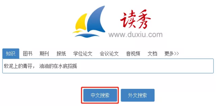 1. 选择知识频道,在搜索框中输入关键词,然后点击“中文搜索”,将为您在海量的图书数据资源中,围绕该关键词深入到图书的每一页资料中进行信息深度查找。