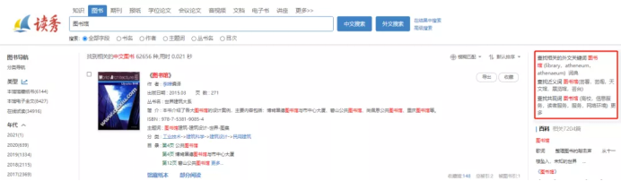 图书普通检索:在搜索框直接输入关键词,关键词可定位到全部字段、书名、作者或主题词中,然后点击“中文搜索”,将为您在海量的图书数据资源中进行查找。如果您希望获得外文资源,可点击“外文搜索”。
