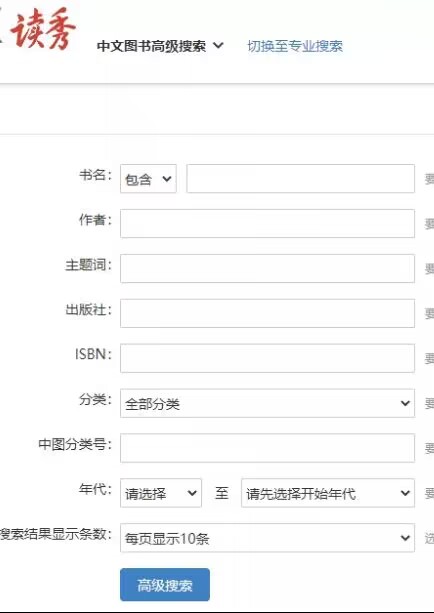 3. 图书专业检索:在文本框中输入您要查找的任意词的任意组合,然后点击搜索。搜索到的范围更精确。