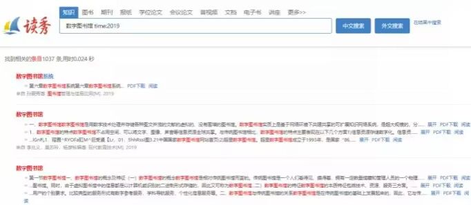 在知识频道下搜索时,在关键词后加上"time:时间",用于命中某一年出版的资料。例如:"数字图书馆 time:2019",搜索结果为2019年的资料。