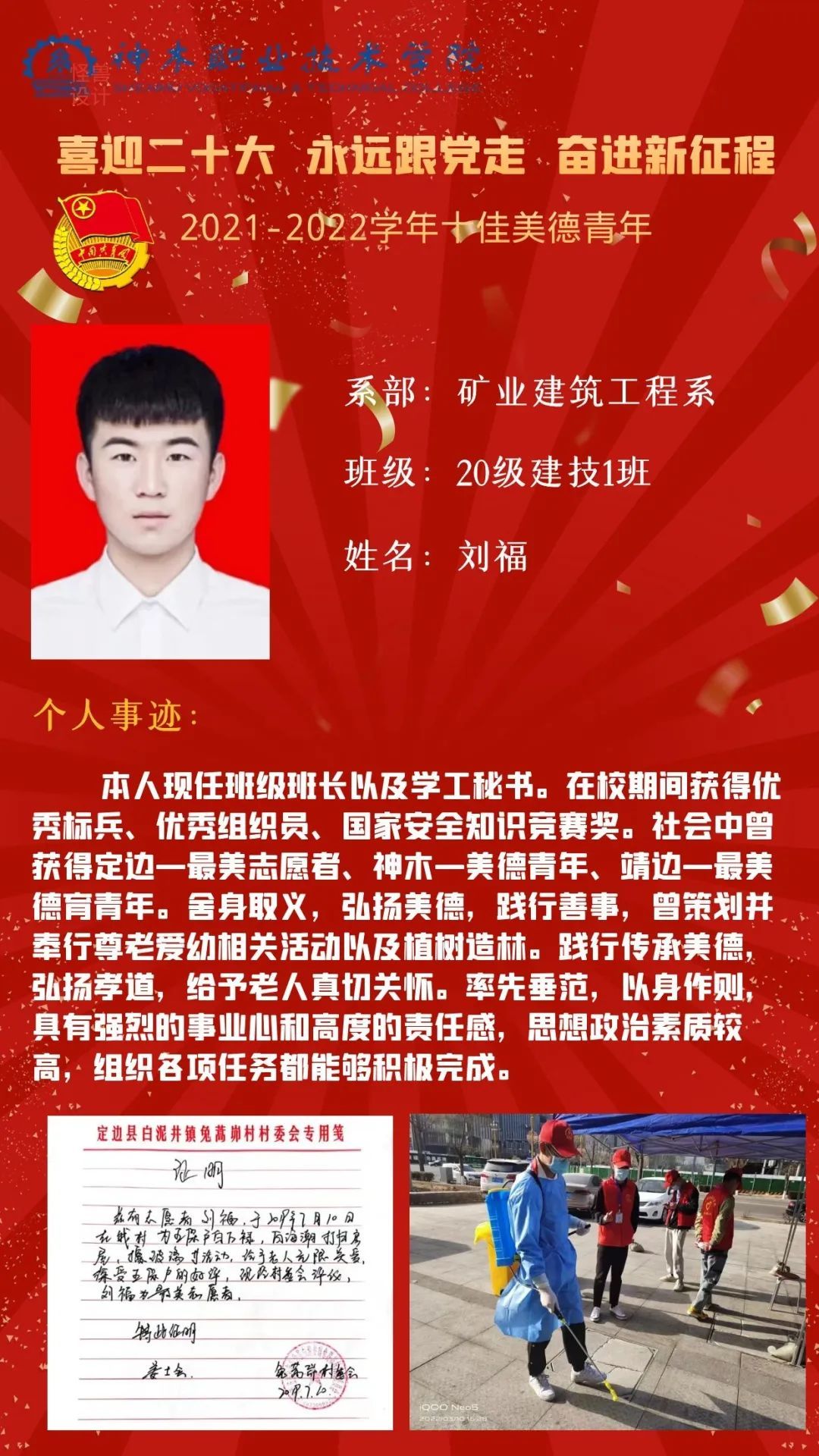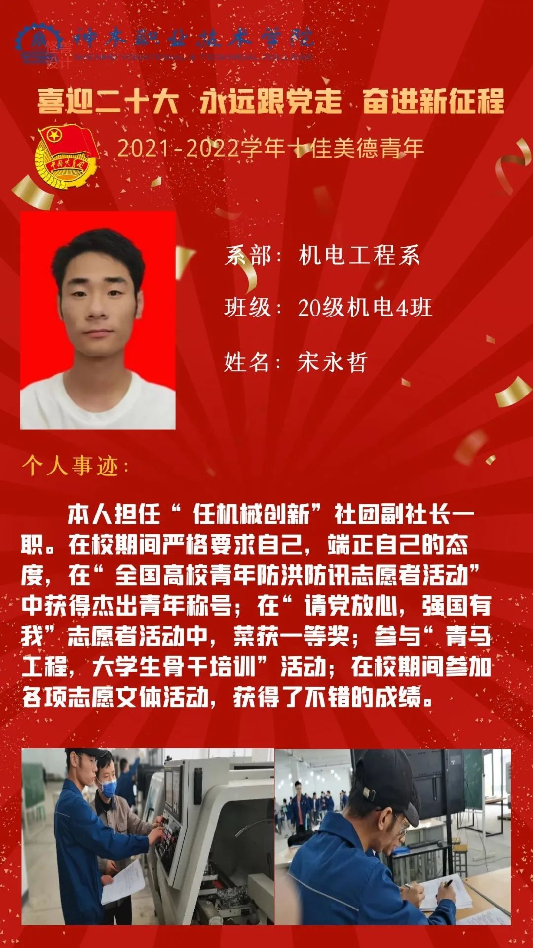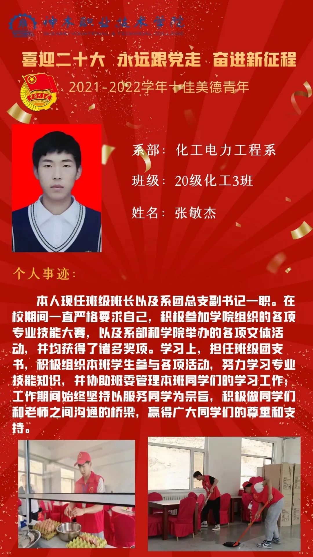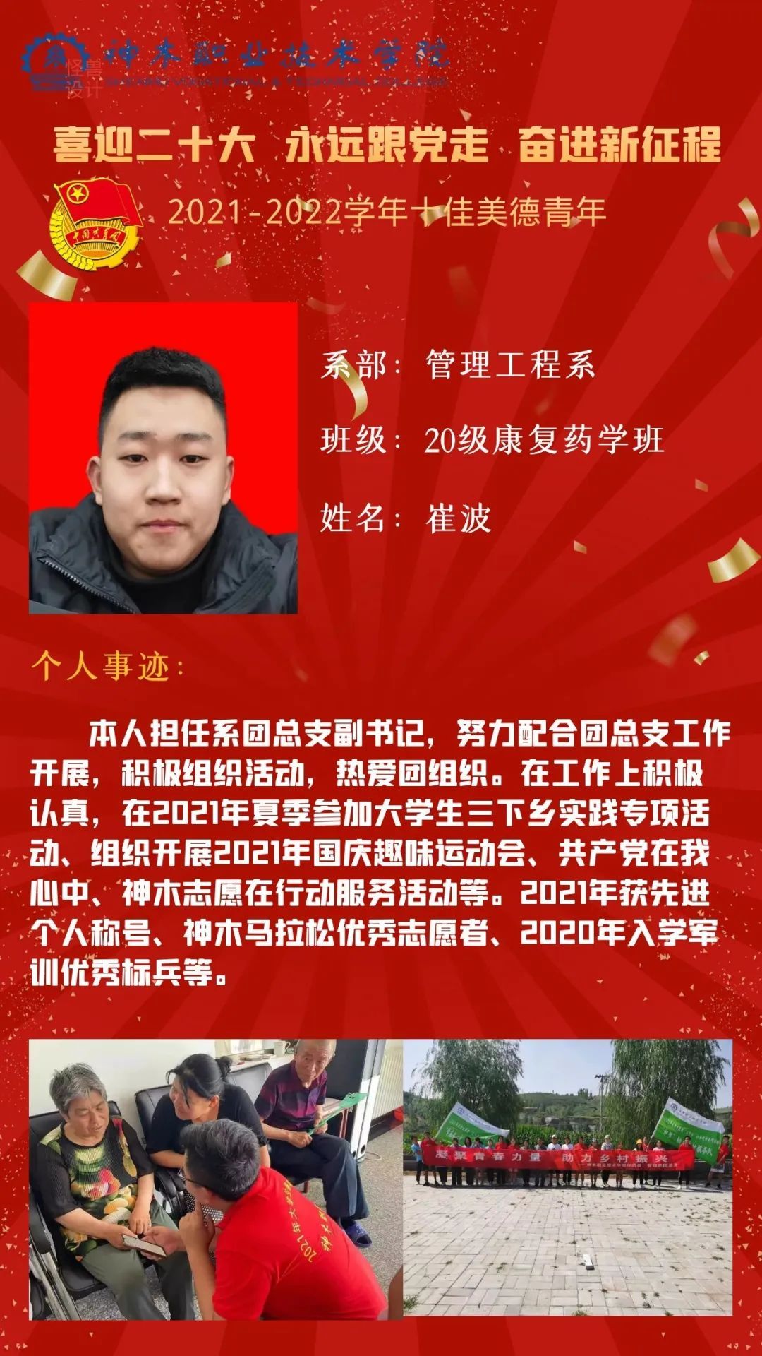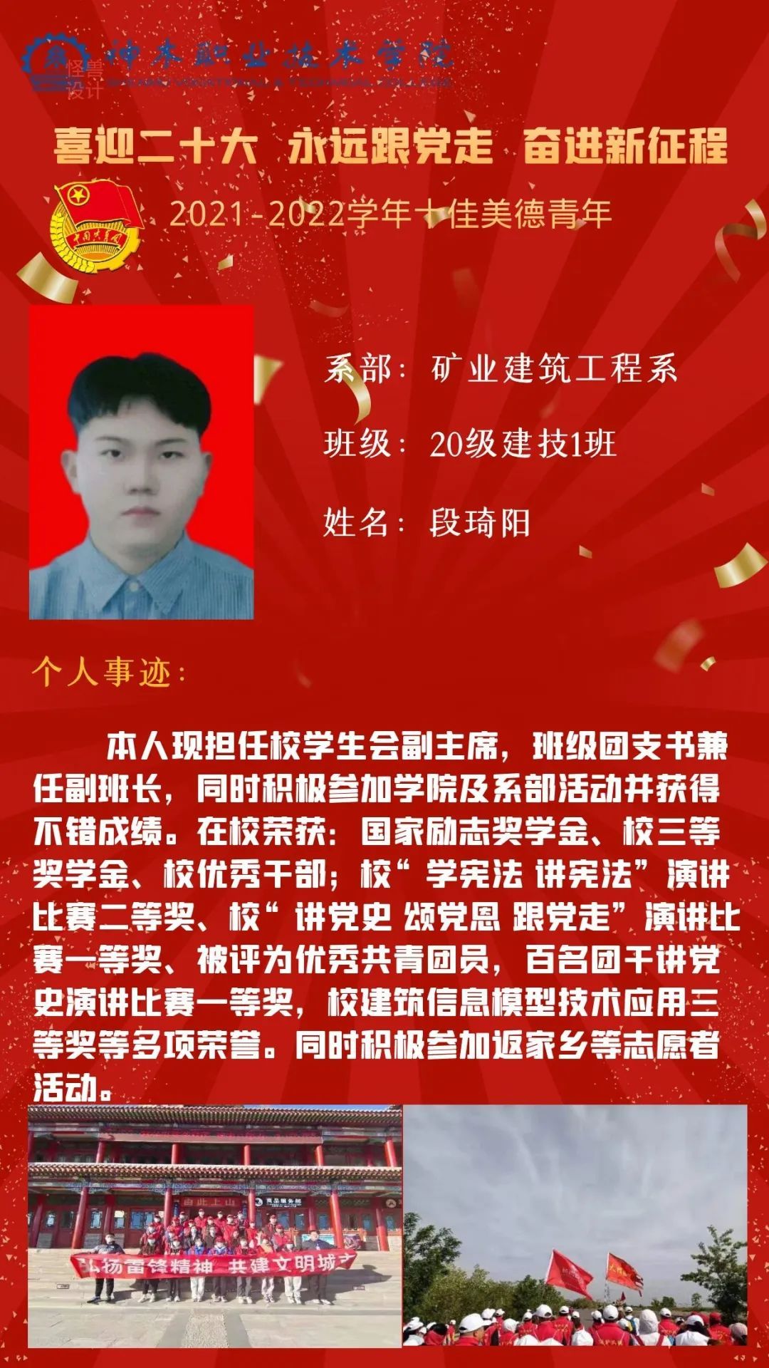 在建团百年之际,为充分发挥青年典型示范引领作用,团结引领团员青年踔厉奋发、砥砺笃行,以优异成绩迎接党的二十大胜利召开,特推出“喜迎二十大 永远跟党走 奋进新征程”神木职院十佳美德青年风采展。