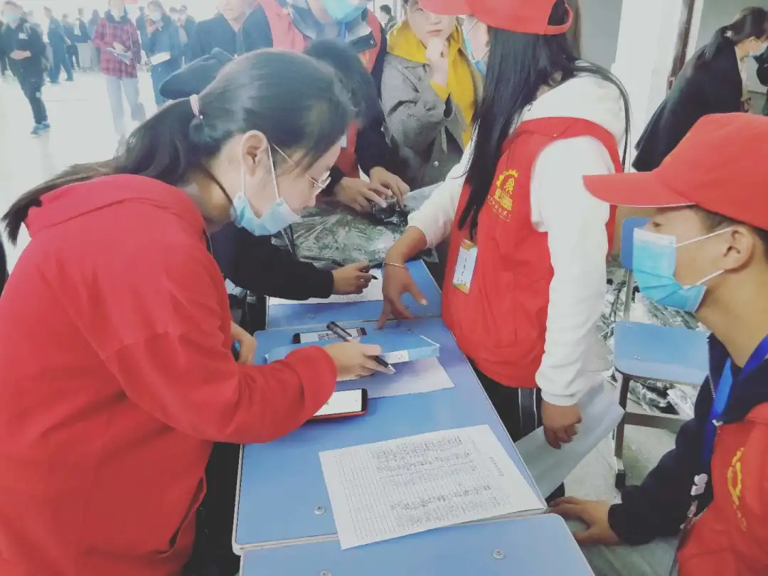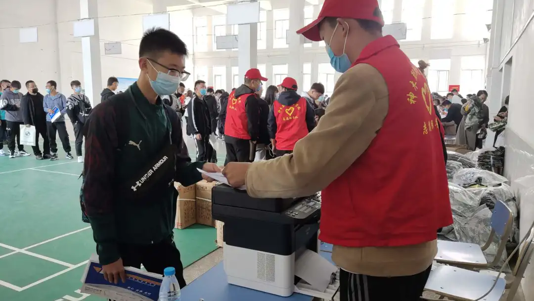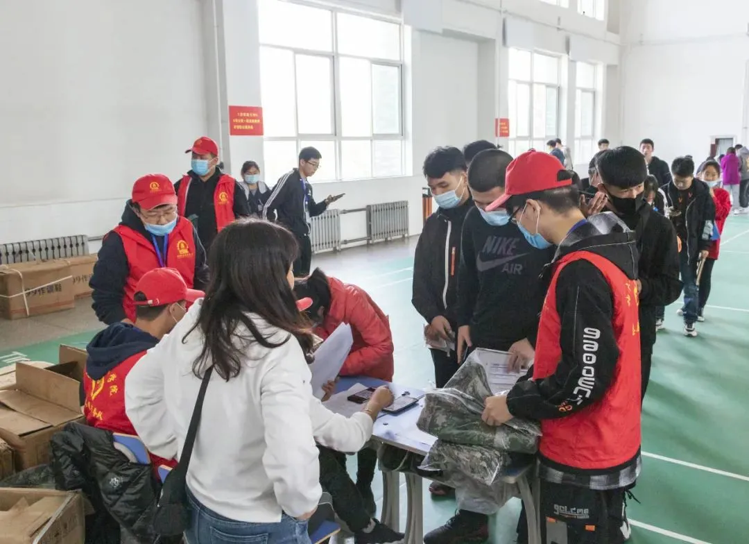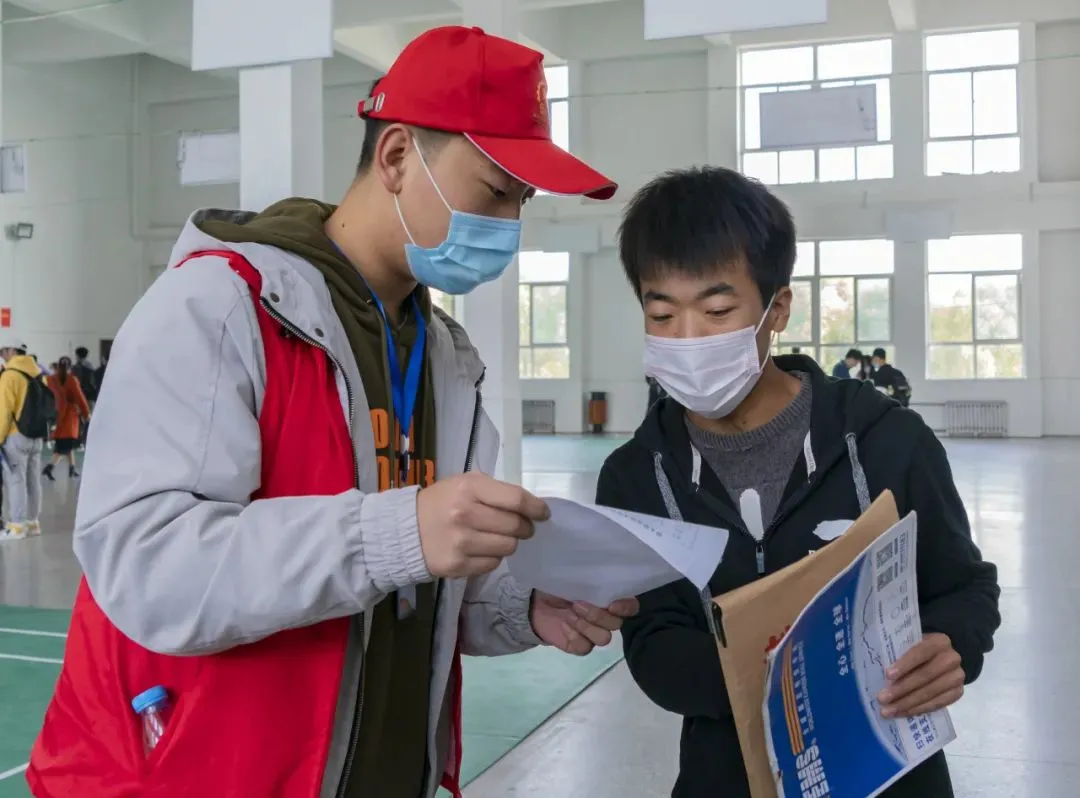 羽毛球场的志愿者为他们耐心的讲解入学手续办理细节以及有序领取军训服,引导他们查看分班情况、宿舍分布;负责引领去宿舍接待的志愿者主动帮忙拎着行李,一路谈笑风生。
