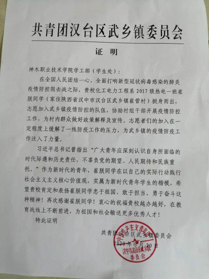 新冠肺炎疫情汹涌来袭,在这一特殊的艰难时刻,无数志愿者以实际行动传递温暖,奉献爱心。我院化工电力工程系2017级热电1班的崔朕同学(家住陕西省汉中市汉台区武乡镇崔营村)也在第一时间自愿加入了家乡的疫情防控协助队伍,为村内群众做好政策解释及宣传工作。