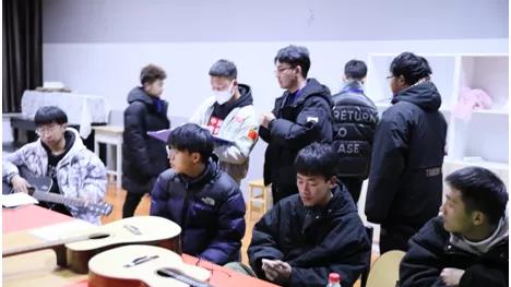 2021年12月15日晚在5号教辅楼开展活动,声乐社团在为元旦晚会做准备,排练大合唱《黑猫警长》,同学们热情高涨,每个人都认真对待。