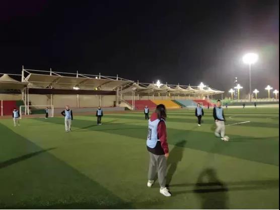 同学们不分男女,在会长的带领下进行了热身,热身可以使肌肉适度放松,使韧带、肌腱适度拉伸,使关节灵活,避免运动损伤;使肌肉获得一个适宜的初始长度,有利于力量和速度的发挥;使呼吸、循环一定程度上变快、变强,避免运动时增加心脏、肺和其他内脏的压力,使气血调动起来,有利于运动中和运动后体力的恢复;使神经系统适度兴奋,使精神振作而又稳定,从而提高运动的力量、反应速度和精确性。