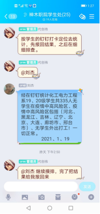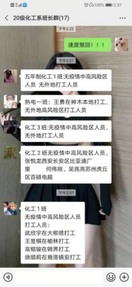 自学生离校至今已有两周时间,学生处结合疫情发展实际情况和我校的学生疫情防控安排。于2021年1月19日要求各系排查我校学生是否有学生在中高风险地区?是否有学生外出打工?各系以国家最新公布的全国疫情中高风险地区名单为依据,对我校全体在籍学生实际情况进行摸排。