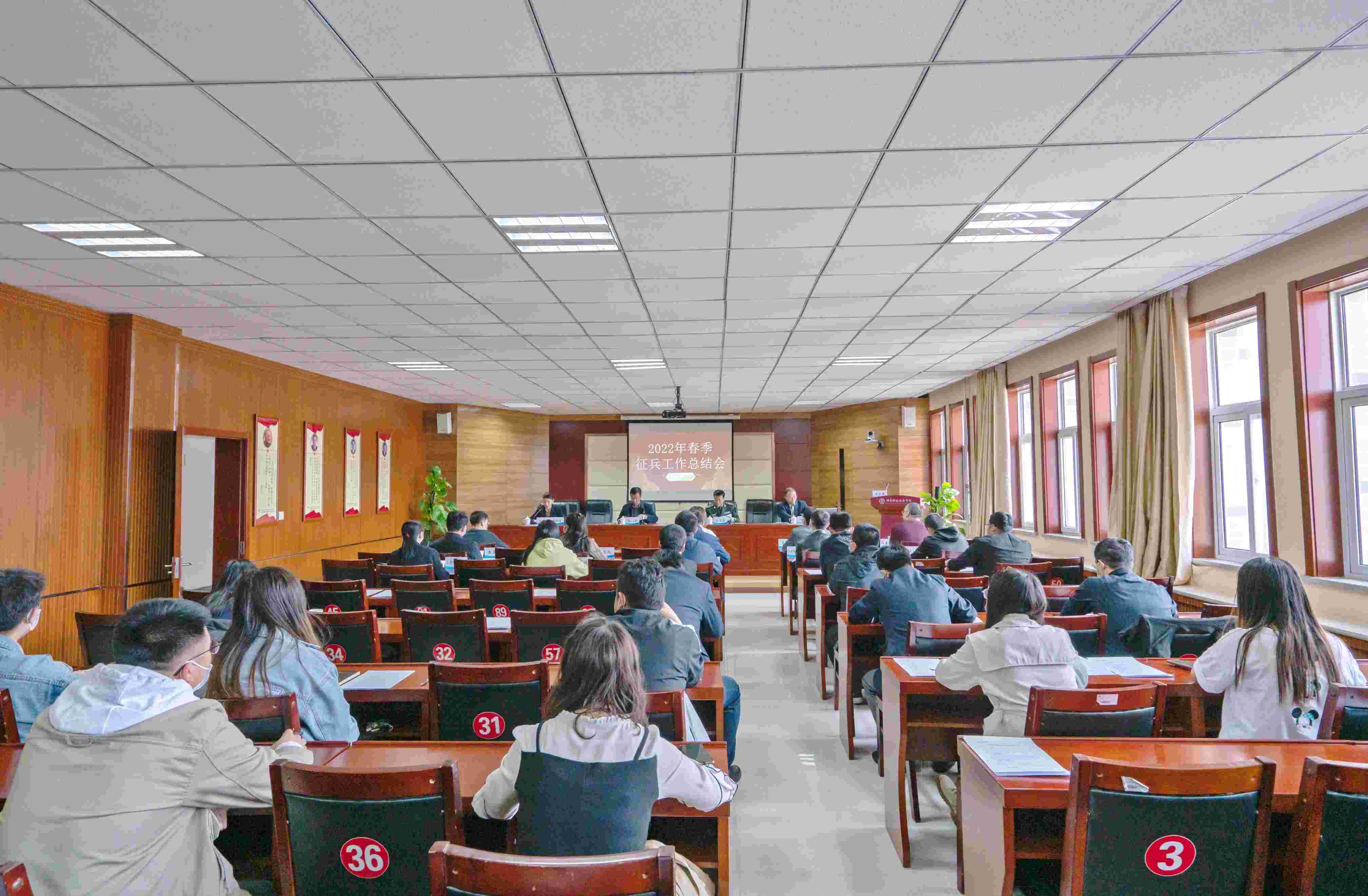 3月31日,365上市公司官网召开2022年春季征兵工作总结会,参会人员有神木市委常委、人武部部长马智磊,365上市公司官网党委书记、校长艾国,副校长郭亚芳,各处室、系部主要负责人,学生处全体人员,全体专职辅导员及部分兼职辅导员。会议由副校长郭亚芳主持。