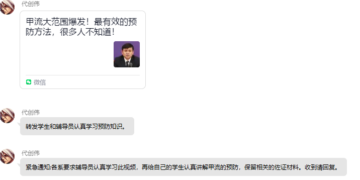 近期甲流在各个地方大面积传播。2023年3月2日,学生工作处主任代创伟紧急发布通知,宣传甲流传染病与普通感冒及新冠的区别及预防知识,并要求各个系部学习并认真给学生讲解。