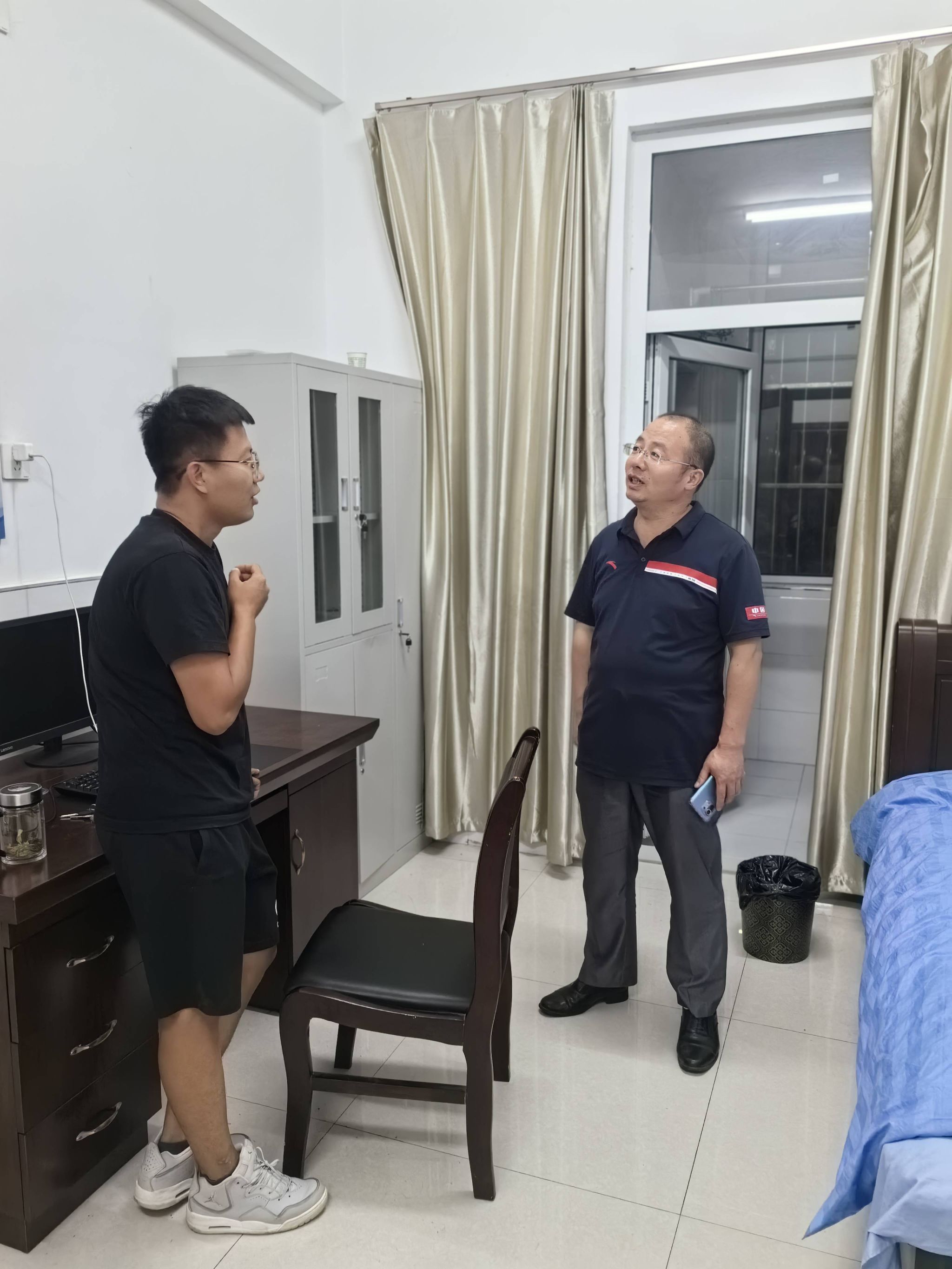 2023年9月10日晚,代创伟处长一行深入学生公寓辅导员值班室,检查辅导员入住公寓值班情况,并对配套设施建设、辅导员夜间值班工作开展等情况进行了详细了解,关切询问入驻辅导员工作、生活情况,听取了他们对入驻学生公寓的意见和建议,并对实地检查中发现的一些问题提出整改要求。