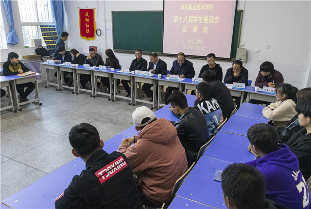 2019年11月14日在3号教学楼3114教室召开第十八届学生座谈会反馈会,此次会议由学生工作处副处长代创伟主持,副校长李广智出席,另外有教务处、后勤处、基建处、团委、实训-继教处、图文信息处、机电工程系、矿业建筑工程系共8个处(室)或系部的工作人员参会。