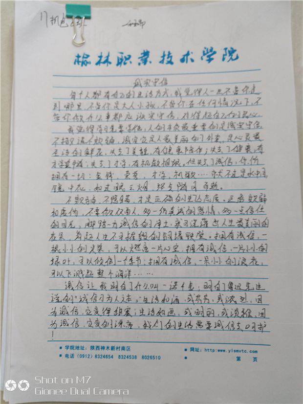 为贯彻落实《关于印发榆林职业技术学院神木校区2018年“感恩于心、励志成才”资助育人实施方案的通知》(榆职神校学发 〔2018〕8号)文件精神,不断强化资助育人理念,全面构建资助育人质量提升体系,学生处组织开展了诚信征文活动。