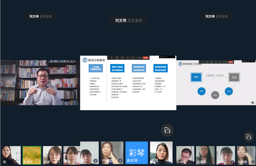 科技处组织召开疫情期间教学督导工作视频会议 为了更加规范、高效的组织和实施新学期教学督导工作,3月23日下午,科技处在钉钉平台组织召开疫情期间教学督导工作视频会议,会议由教学督导组秘书长刘文伟主持,教学督导组全体成员参加了本次会议。 会议由两部分组...