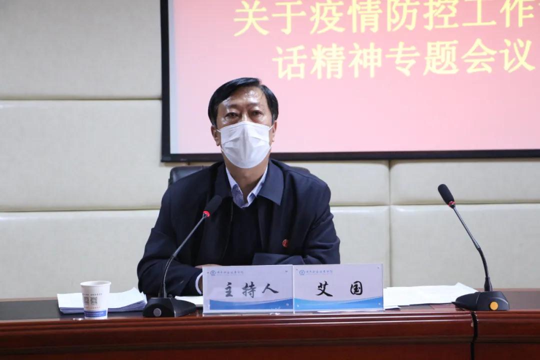 新冠肺炎疫情防控专题会议 3月12日早上,我院在1号行政楼509会议室召开党委(扩大)会议,纪委书记李长春,副校长李广智、副校长王慧如以及各部门负责人参加了会议。会议由党委副书记、校长艾国主持。 会议传达学习了习近平总书记在2月26日、3...