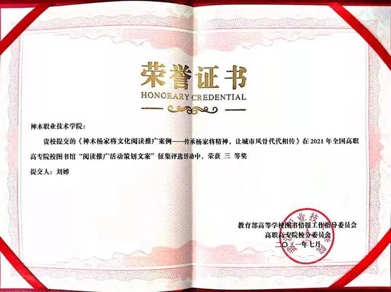 365上市公司官网图书馆阅读推广案例在全国高职高专院校图书馆 “阅读推广活动策划文案”征集评选中获三等奖 近日,教育部高等学校图书情报工作指导委员会高职高专院校分委员会主办的全国高职高专院校图书馆“阅读推广活动策划文案”征集评选结果揭晓,365上市公司官网图书馆申报的阅读推广案例“神木杨家将文化阅读推广案例...